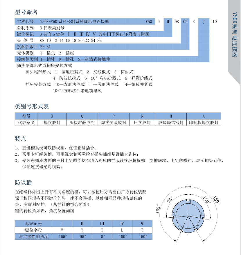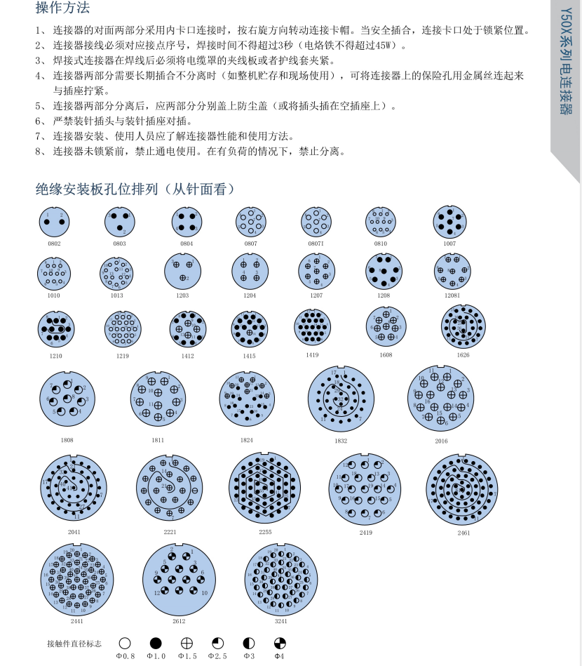 該系列航空插頭分三大類,Y50X是公制尺寸,同芯數(shù)外殼體尺寸偏大,插座安裝方式有方盤式,螺母緊固式及穿墻式,端接形式為焊接式,根據(jù)使用環(huán)境選擇不銹鋼或銅、鋁合金材料,一般用于戰(zhàn)略戰(zhàn)術(shù)系統(tǒng),電子對抗系統(tǒng),通訊信號連接系統(tǒng) ,進(jìn)口醫(yī)療儀器設(shè)備等電能,電訊信號的連接。