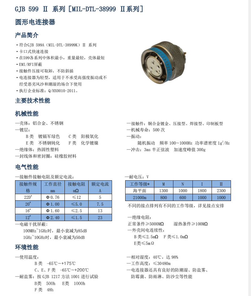 GJB599II輕型圓形電連接器,體積小,重量輕,接點(diǎn)密度高,殼體短,接觸件壓接可取卸,不防斜插,適用于不承受高強(qiáng)度振動(dòng)或風(fēng)沙風(fēng)雨的場合使用。